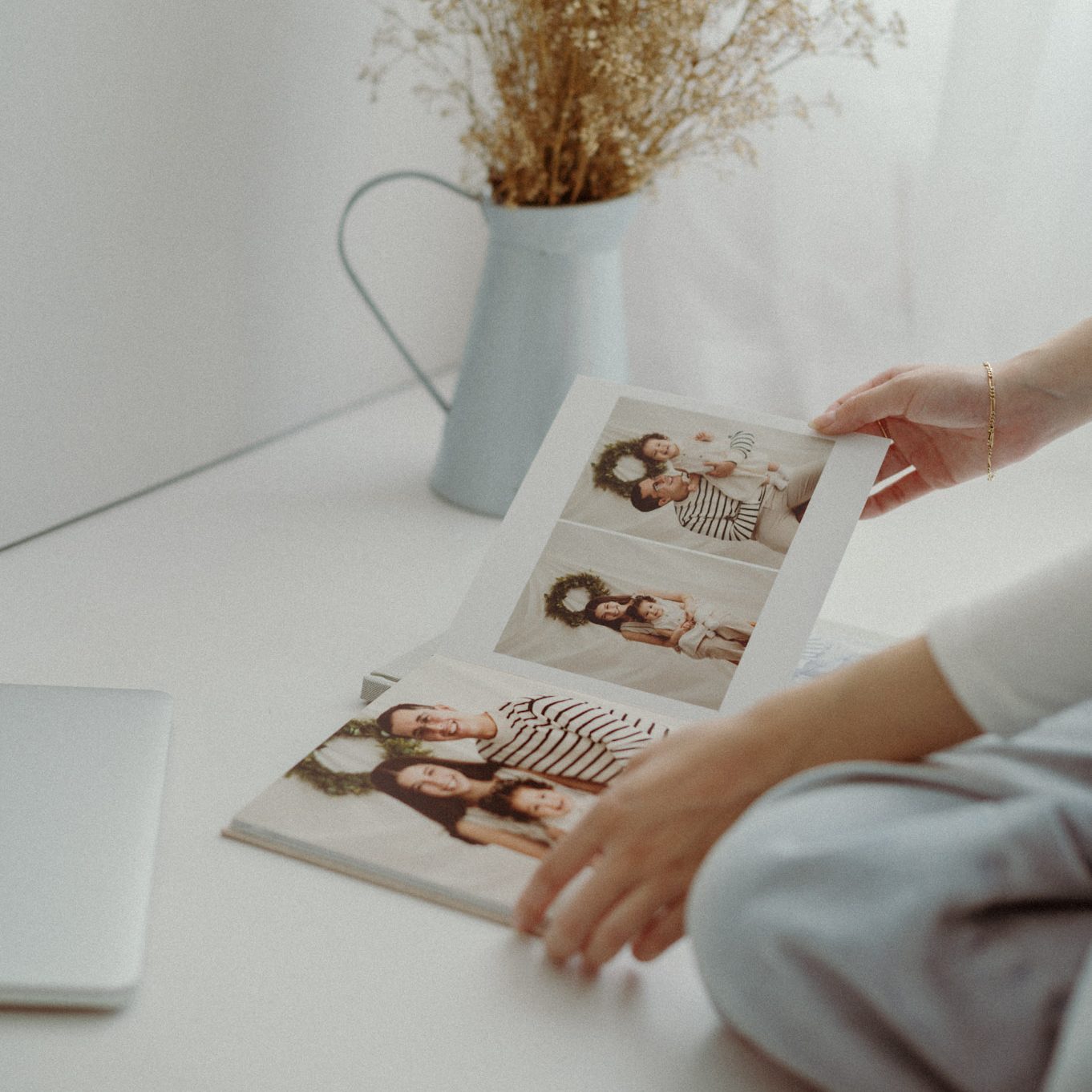 Todos nuestros photobooks incluyen 12 páginas de papel fotográfico de alta calidad contraplacadas con planchas de PVC autoadhesivas, lo que permite una apertura de 180°. La portada es de lino artesanal y contiene un grabado personalizado.